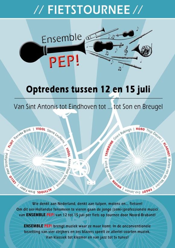 Wie denkt aan Nederland, denkt aan tulpen, molens en… fietsen! Om dit oer-Hollandse fenomeen te vieren gaan de musici van Ensemble PEP! iedere zomer per fiets op tournee.