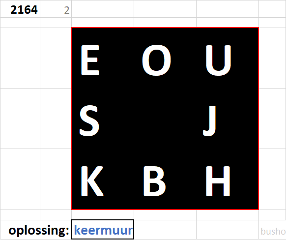 - Het tabblad paardensprong bevat alle informatie uit deze conversie. In cel A1 zie je de identificatiecode (ID) van het woord dat wordt getoond. Dit is een willekeurig getal tussen de 1 en de 14.860 (want zoveel woorden stonden er in de lijst, weet je nog?). Cel A2 is een 1 of een 2, ook willekeurig gekozen, en geeft de leesrichting aan van de paardensprong. Samen vormen deze codes de basis voor de getoonde paardensprong: de geconverteerde lijst wordt nagezocht op het ID, en zo worden de acht letters in paardensprong-vorm in de juiste leesrichting gegoten. Rechts onderin wordt de corresponderende oplossing opgehaald, als je er niet uitkomt.