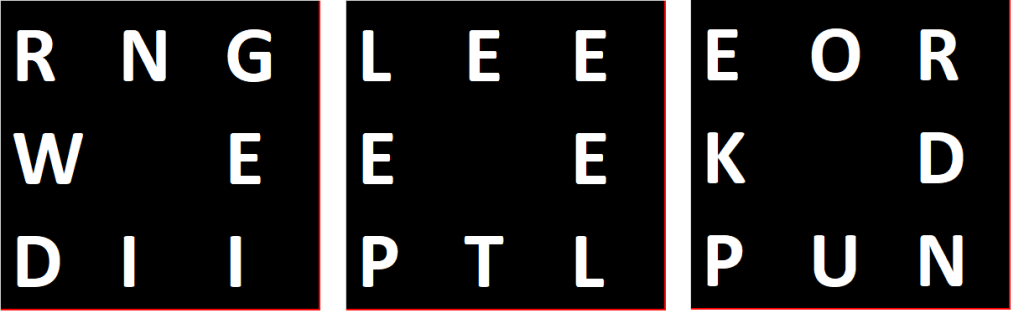 - In het tabblad conversie worden de woorden speelklaar gemaakt. Eerst wordt het woord gesplitst, zodat er 1 cel per letter is (kolommen B-I). Vervolgens wordt het beginpunt van het woord willekeurig gemaakt (kolommen J-Q), zodat de beginletter van het woord straks niet altijd in de linkerbovenhoek van de paardensprong terecht komt. Tot slot is de woordvolgorde ook nog een keer omgedraaid, zodat je niet altijd dezelfde kant op hoeft te draaien (kolommen R-Y).