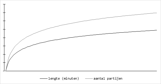 We beginnen met lengte (in minuten) en het aantal partijen. De veronderstelling is dat langere stukken met meer partijen méér tijd kosten om te maken. Tegelijkertijd kun je aannemen dat die verhouding op een goed moment af vlakt: een stuk van 2 minuten kost relatief veel meer tijd om te arrangeren dan een stuk van 1 minuut, maar een stuk van 29 minuten kost niet ineens veel meer tijd als het 30 minuten wordt – even ervan uitgaande dat het geen Jean Barraqué is. Evengoed is het minder arbeidsintensief als je van 15 naar 16 partijen gaat dan wanneer je van 1 naar 2 partijen gaat.