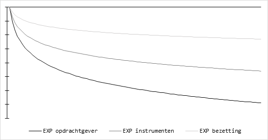 Tot slot kijken we naar hoe de drie vormen van ervaring (opdrachtgever, instrumenten, bezetting) van invloed kan zijn op het aantal gewerkte uren. Ervaring zou kunnen worden uitgedrukt als het aantal eerdere opdrachten voor de opdrachtgever, de instrumenten, of de bezetting.5 Hieronder wordt het veronderstelde effect op het aantal gewerkte uren getoond, waarbij we zien dat voor de opdrachtgever het grootste effect wordt verondersteld, gevolgd door instrument en bezetting.