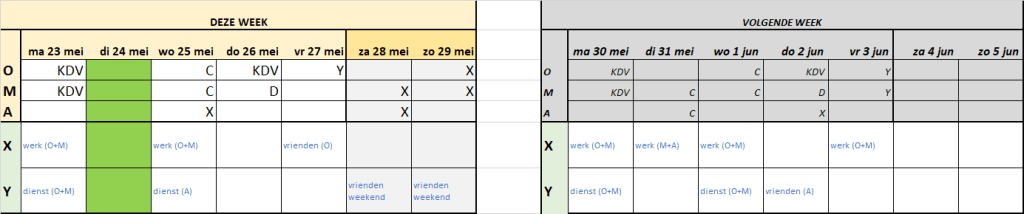 - Kolommen C-E bevat het befaamde OMA-schema: Ochtend, Middag, Avond. De invoer per dag verbeeldt de personen die de supervisie over het kind hebben gedurende de Ochtend, Middag, of Avond. Op Woensdag 25 Mei is het kind bijvoorbeeld in de Ochtend (O) en de Middag (M) bij oma C, en in de Avond (A) legt X hem in bed.