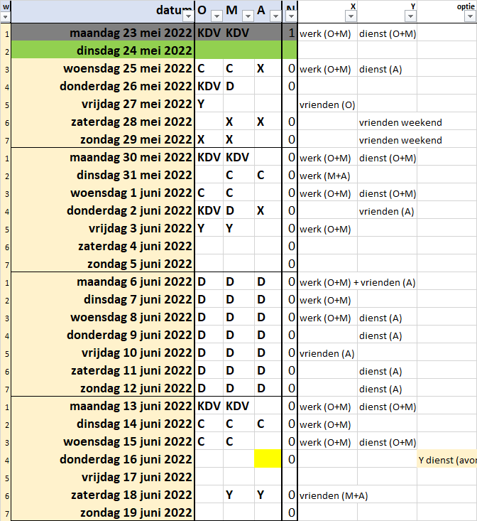 - Kolommen G-H bevatten een korte toelichting van de bezigheden van X en Y. Zo is de te lezen dat X en Y beiden op Maandag 23 mei overdag hebben gewerkt. Gelukkig maar dat het kind bij de KDV (kinderdagverblijf, ik weet het: eigenlijk het KDV) terecht kon.