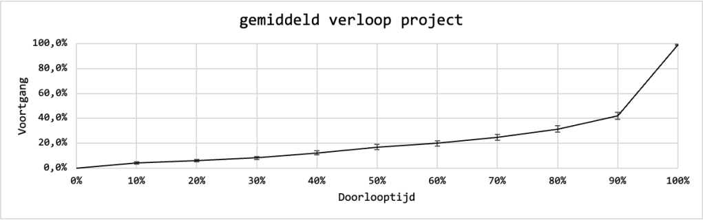 Hieruit blijkt dat ik 60% van het arrangement pas afmaak als 90% van de doorlooptijd is verstreken! Blijkbaar kom ik pas in beweging (of heb ik pas tijd) als de deadline écht nadert.