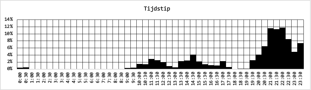 Tijdschrijven heeft me laten zien wanneer ik op mijn productiefst ben: in de avond, met een enkele uitschieter naar de nacht. Overdag is (meestal) gereserveerd voor andere dingen. Onderstaande figuur, gebaseerd op alle invoer van 2023 (N = 537), laat dit aardig zien: