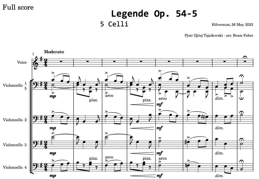 Vorig jaar arrangeerde ik de Legende, Op. 54-5 van Pjotr Iljitsj Tsjaikovski. Volg deze link voor de bladmuziek: https://imslp.org/wiki/Special:ReverseLookup/977297