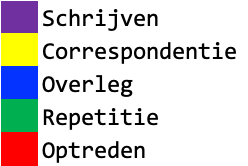 Als ik de activiteiten per opdracht op een rijtje zet volgens deze kleurcodering, dan leidt dat tot het volgende beeld: