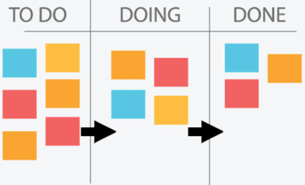 Voor Kanban maak je gebruik van een bord om een bepaalde workflow te tonen, en de hoeveelheid werk die er op dit moment in zit. Bijvoorbeeld om te tonen welke klussen je nog moet doen, welke klussen je nu mee bezig bent, en welke klussen je klaar hebt: