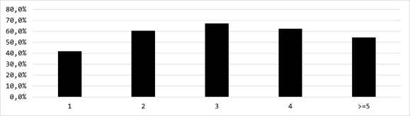 Onderstaande figuur toont het aandeel goed beantwoorde vragen, uitgesplitst voor hoe vaak de vraag is gesteld. Hieruit blijkt dat ik een vraag, bij eerste blootstelling, zo’n 40% van de keren goed kon beantwoorden, en dat dit oploopt tot 67% bij de derde keer stellen.